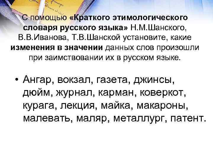 С помощью «Краткого этимологического словаря русского языка» Н. М. Шанского, В. В. Иванова, Т. В. Шанской установите, какие изменения в значении данных слов произошли при заимствовании их в русском языке. • Ангар, вокзал, газета, джинсы, дюйм, журнал, карман, коверкот, курага, лекция, майка, макароны, малевать, маляр, металлург, патент.