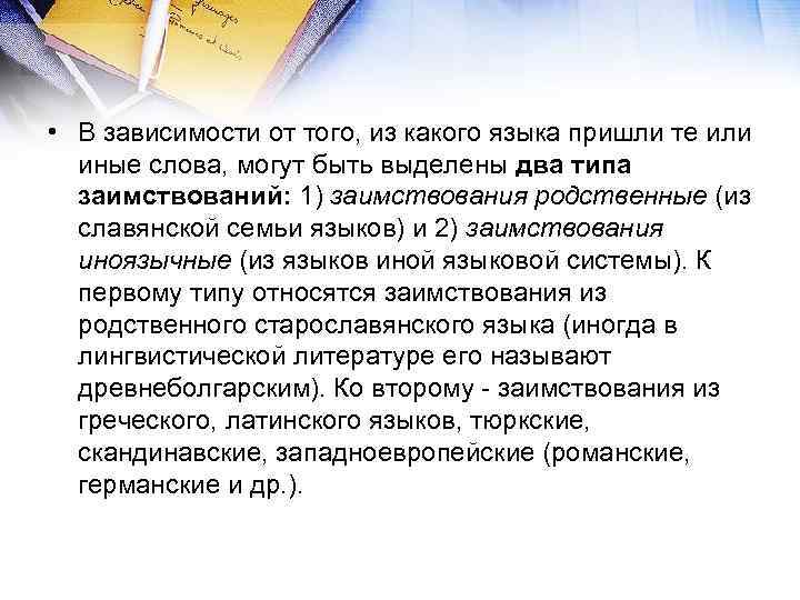 • В зависимости от того, из какого языка пришли те или иные слова, могут быть выделены два типа заимствований: 1) заимствования родственные (из славянской семьи языков) и 2) заимствования иноязычные (из языков иной языковой системы). К первому типу относятся заимствования из родственного старославянского языка (иногда в лингвистической литературе его называют древнеболгарским). Ко второму - заимствования из греческого, латинского языков, тюркские, скандинавские, западноевропейские (романские, германские и др. ).