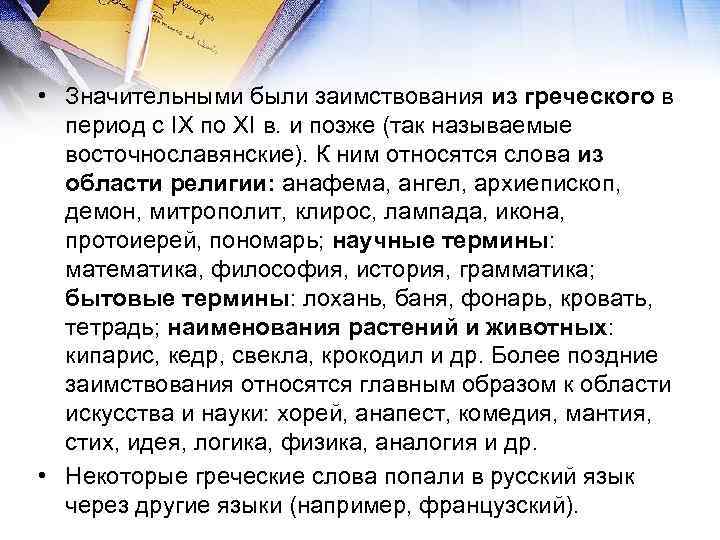 • Значительными были заимствования из греческого в период с IX по XI в. и позже (так называемые восточнославянские). К ним относятся слова из области религии: анафема, ангел, архиепископ, демон, митрополит, клирос, лампада, икона, протоиерей, пономарь; научные термины: математика, философия, история, грамматика; бытовые термины: лохань, баня, фонарь, кровать, тетрадь; наименования растений и животных: кипарис, кедр, свекла, крокодил и др. Более поздние заимствования относятся главным образом к области искусства и науки: хорей, анапест, комедия, мантия, стих, идея, логика, физика, аналогия и др. • Некоторые греческие слова попали в русский язык через другие языки (например, французский).