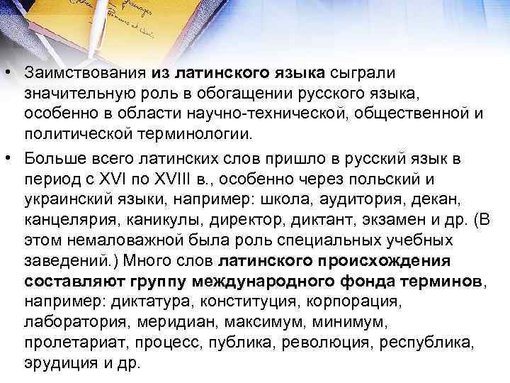 • Заимствования из латинского языка сыграли значительную роль в обогащении русского языка, особенно в области научно-технической, общественной и политической терминологии. • Больше всего латинских слов пришло в русский язык в период с XVI по XVIII в. , особенно через польский и украинский языки, например: школа, аудитория, декан, канцелярия, каникулы, директор, диктант, экзамен и др. (В этом немаловажной была роль специальных учебных заведений. ) Много слов латинского происхождения составляют группу международного фонда терминов, например: диктатура, конституция, корпорация, лаборатория, меридиан, максимум, минимум, пролетариат, процесс, публика, революция, республика, эрудиция и др.