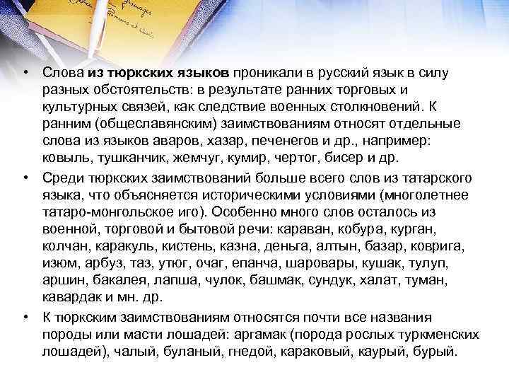 • Слова из тюркских языков проникали в русский язык в силу разных обстоятельств: в результате ранних торговых и культурных связей, как следствие военных столкновений. К ранним (общеславянским) заимствованиям относят отдельные слова из языков аваров, хазар, печенегов и др. , например: ковыль, тушканчик, жемчуг, кумир, чертог, бисер и др. • Среди тюркских заимствований больше всего слов из татарского языка, что объясняется историческими условиями (многолетнее татаро-монгольское иго). Особенно много слов осталось из военной, торговой и бытовой речи: караван, кобура, курган, колчан, каракуль, кистень, казна, деньга, алтын, базар, коврига, изюм, арбуз, таз, утюг, очаг, епанча, шаровары, кушак, тулуп, аршин, бакалея, лапша, чулок, башмак, сундук, халат, туман, кавардак и мн. др. • К тюркским заимствованиям относятся почти все названия породы или масти лошадей: аргамак (порода рослых туркменских лошадей), чалый, буланый, гнедой, караковый, каурый, бурый.