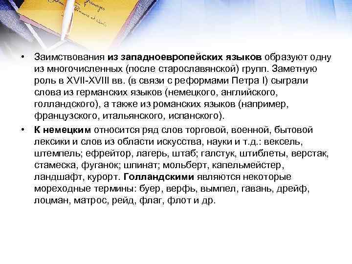 • Заимствования из западноевропейских языков образуют одну из многочисленных (после старославянской) групп. Заметную роль в XVII-XVIII вв. (в связи с реформами Петра I) сыграли слова из германских языков (немецкого, английского, голландского), а также из романских языков (например, французского, итальянского, испанского). • К немецким относится ряд слов торговой, военной, бытовой лексики и слов из области искусства, науки и т. д. : вексель, штемпель; ефрейтор, лагерь, штаб; галстук, штиблеты, верстак, стамеска, фуганок; шпинат; мольберт, капельмейстер, ландшафт, курорт. Голландскими являются некоторые мореходные термины: буер, верфь, вымпел, гавань, дрейф, лоцман, матрос, рейд, флаг, флот и др.