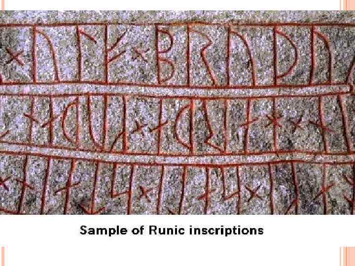 РУНИЧЕСКИЙ АЛФАВИТ Письменность на английском языке появилась примерно с V века н. э. , для записи использовались англосаксонские руны, сохранилось лишь несколько небольших фрагментов записей того времени. Замена рун на латинские буквы началась с VII века с приходом христианских миссионеров.