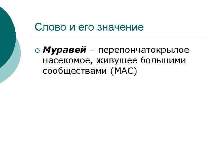 Слово и его значение ¡ Муравей – перепончатокрылое насекомое, живущее большими сообществами (МАС)