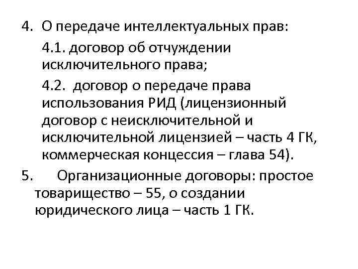 4. О передаче интеллектуальных прав: 4. 1. договор об отчуждении исключительного права; 4. 2. договор о передаче права использования РИД (лицензионный договор с неисключительной и исключительной лицензией – часть 4 ГК, коммерческая концессия – глава 54). 5. Организационные договоры: простое товарищество – 55, о создании юридического лица – часть 1 ГК.