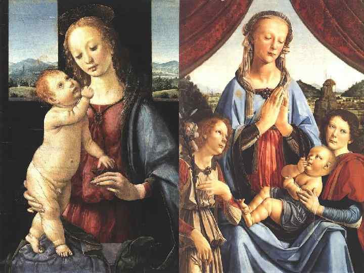 У ранніх творах (голова ангела в “Хрещенні”; “Благовіщення”; “Мадонна, Бенуа”). Леонардо да Вінчі розвиває традиції кватроченто, підкреслюючи плавну об’ємність форми м’якою світлотінню, іноді оживлюючи обличчя мало помітною посмішкою; у композиції “Поклоніння волхвів” (1181 -82, не закінчена, підмальовка — в Уффіці) він, перетворює релігійний сюжет у дзеркало різноманітних людських емоцій, розробляючи новаторські методи малюнку.