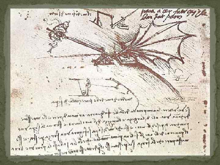 Леонардо да Винчи интересовали проблемы полёта. В Милане он делал много рисунков и изучал летательный механизм птиц разных пород и летучих мышей. Кроме наблюдений, он проводил и опыты, но они все были неудачными. Леонардо очень хотел построить летательный аппарат. Он говорил: «Кто знает всё, тот может всё. Только бы узнать — и крылья будут!» . Сначала Леонардо разрабатывал проблему полёта при помощи крыльев, приводимых в движение мышечной силой человека: идея простейшего аппарата Дедала и Икара.