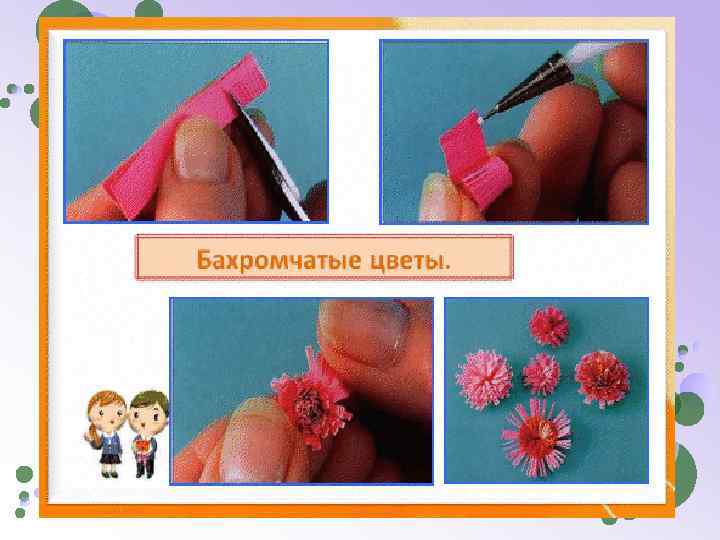 Техника квиллинга Возьми полоску бумаги двумя пальцами. Плотно накрути несколько витков на шило или стержень. Когда диаметр валика станет 3— 4 мм, его уже можно снять с шила и дальше крутить вручную А теперь слегка расслабь пальцы, позволяя бумажной спирали немного распуститься Приклей конец полоски клеем ПВА.
