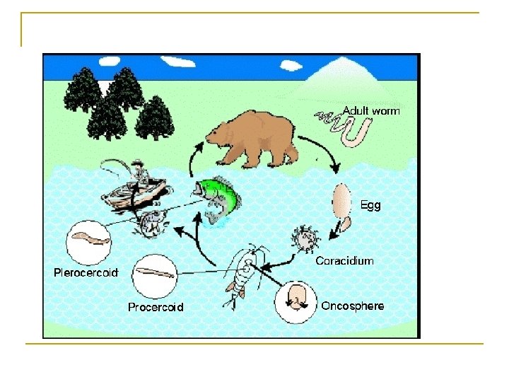 Epidemiologie n n Contamination par ingestion de poisson d’eau douce Botriocephalose présente dans toutes les régions lacustres du monde où l’homme consomme des poissons crus ou mal cuits (Europe, USA, Asie) (ex : lac Leman) HD = mammifère ichtyophage 3 HI : q q q 1 er HI = crustacée (larve procercoide) 2 eme HI : petit poisson (larve plerocercoide infestante) 3 eme HI : poisson carnivore (brochet, salmonidé…)