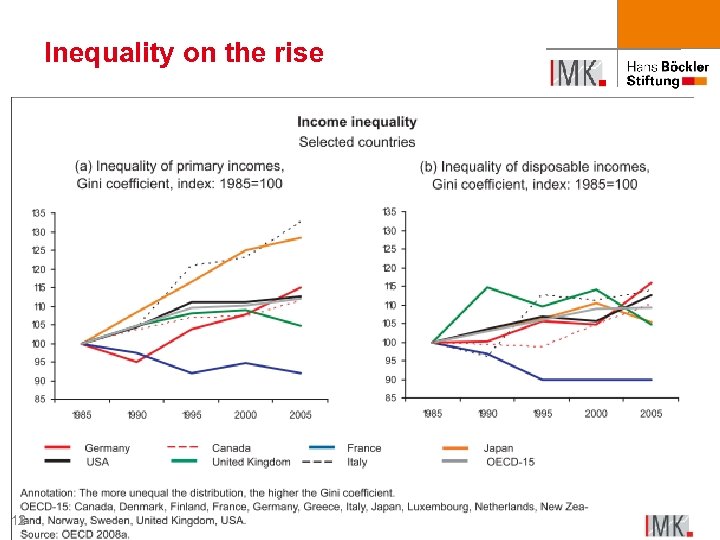 Massive dismantling of the welfare state n pension cuts while at the same time subsidising private saving („Riester-Rente“) n cuts in unemployment benefits and duration („Hartz IV“), stricter enforcement n cuts in public health insurance n deregulation in employment protection and labour market laws n large-scale privatisations 11