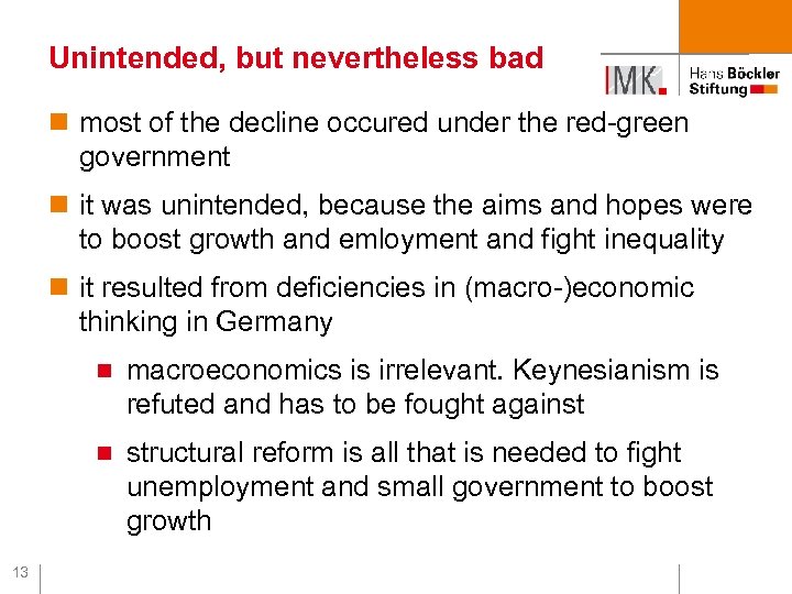 Unintended, but nevertheless bad n most of the decline occured under the red-green government n it was unintended, because the aims and hopes were to boost growth and emloyment and fight inequality n it resulted from deficiencies in (macro-)economic thinking in Germany n n 13 macroeconomics is irrelevant. Keynesianism is refuted and has to be fought against structural reform is all that is needed to fight unemployment and small government to boost growth