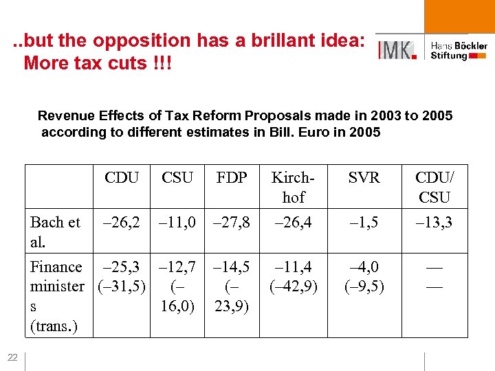 . . but the opposition has a brillant idea: More tax cuts !!! Revenue Effects of Tax Reform Proposals made in 2003 to 2005 according to different estimates in Bill. Euro in 2005 CDU CSU FDP Kirchhof SVR CDU/ CSU – 26, 2 – 11, 0 – 27, 8 – 26, 4 – 1, 5 – 13, 3 Finance – 25, 3 – 12, 7 minister (– 31, 5) (– s 16, 0) (trans. ) – 14, 5 (– 23, 9) – 11, 4 (– 42, 9) – 4, 0 (– 9, 5) –– –– Bach et al. 22