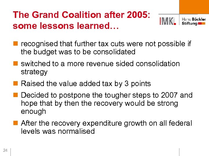Contents n Introduction n Germany‘s poor economic and social performance over the last 10 years n Red-green tax reforms (1998 -2005) and their consequences n Fiscal Policy under the Grand Coalition I (2005 to 2008) – some lessons learned? n Fiscal Policy under the Grand Coalition II (2008 to 2009) – a return to Keynesian fiscal policy? n Fiscal Policy under the new conservative-liberal government: Debt brake and aggressive further tax cuts 23