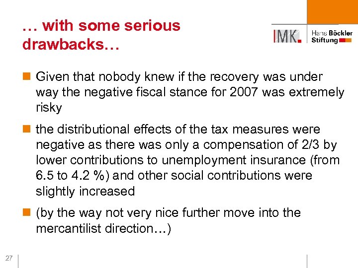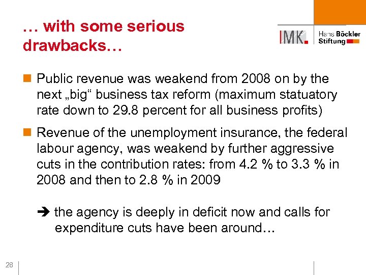 … with some serious drawbacks… n Given that nobody knew if the recovery was under way the negative fiscal stance for 2007 was extremely risky n the distributional effects of the tax measures were negative as there was only a compensation of 2/3 by lower contributions to unemployment insurance (from 6. 5 to 4. 2 %) and other social contributions were slightly increased n (by the way not very nice further move into the mercantilist direction…) 27