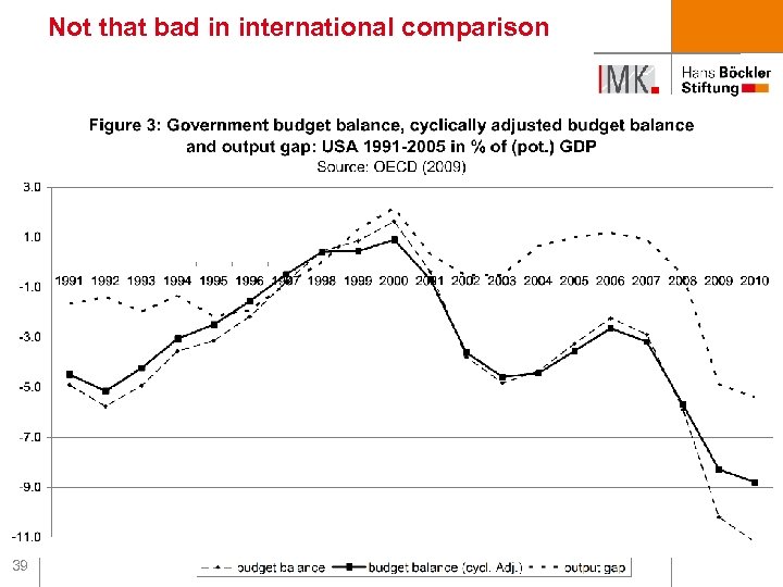 But no change of the general paradigm Fiscal Policy: n important improvement compared with last recession n overall reaction slightly better than EMU-average n but again weaker than in the U. S. n and certainly not enough to counter the recession n German government prevented international co-ordination 40