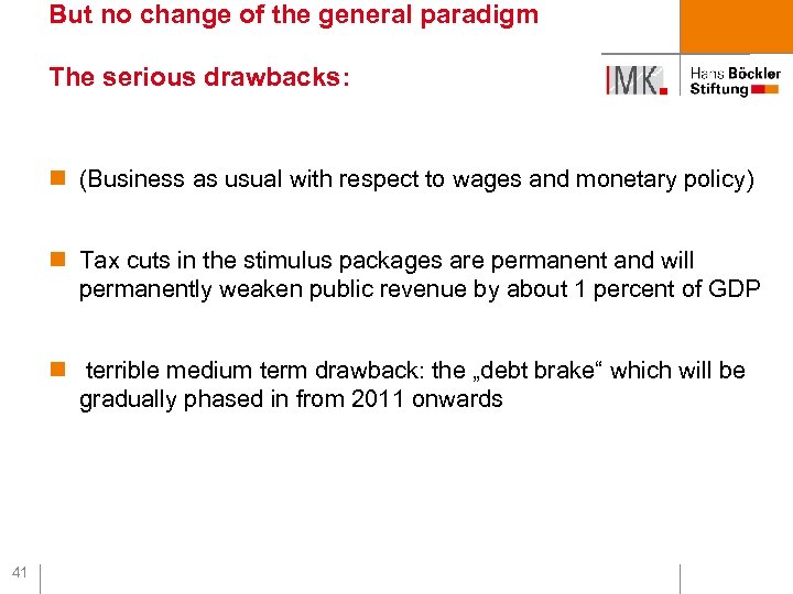 But no change of the general paradigm The serious drawbacks: n (Business as usual with respect to wages and monetary policy) n Tax cuts in the stimulus packages are permanent and will permanently weaken public revenue by about 1 percent of GDP n terrible medium term drawback: the „debt brake“ which will be gradually phased in from 2011 onwards 41