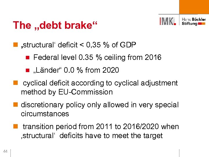 The „debt brake“ n ‚structural‘ deficit < 0, 35 % of GDP n Federal level 0. 35 % ceiling from 2016 n „Länder“ 0. 0 % from 2020 n cyclical deficit according to cyclical adjustment method by EU-Commission n discretionary policy only allowed in very special circumstances n transition period from 2011 to 2016/2020 when ‚structural‘ deficits have to meet the target 44
