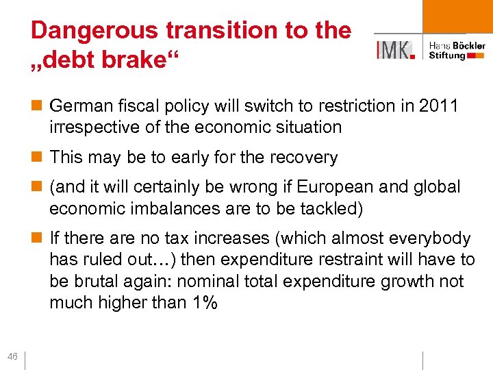 The „debt brake“: errors in construction… n relies almost completely on built-in stabilisers n but built-in stabilisers will be counteracted because cyclical deficit will be calculated according to technocratical cyclical adjustment method by EUCommission serious procyclicalities n transition period from 2011 to 2016/2020 when ‚structural‘ deficits have to meet the target very dangerous 45