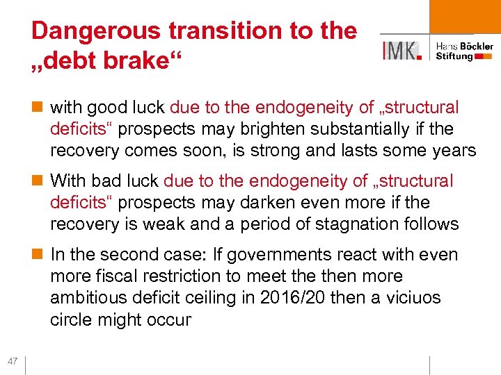 Dangerous transition to the „debt brake“ n with good luck due to the endogeneity of „structural deficits“ prospects may brighten substantially if the recovery comes soon, is strong and lasts some years n With bad luck due to the endogeneity of „structural deficits“ prospects may darken even more if the recovery is weak and a period of stagnation follows n In the second case: If governments react with even more fiscal restriction to meet then more ambitious deficit ceiling in 2016/20 then a viciuos circle might occur 47