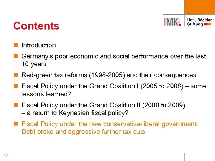 Contents n Introduction n Germany‘s poor economic and social performance over the last 10 years n Red-green tax reforms (1998 -2005) and their consequences n Fiscal Policy under the Grand Coalition I (2005 to 2008) – some lessons learned? n Fiscal Policy under the Grand Coalition II (2008 to 2009) – a return to Keynesian fiscal policy? n Fiscal Policy under the new conservative-liberal government: Debt brake and aggressive further tax cuts 48