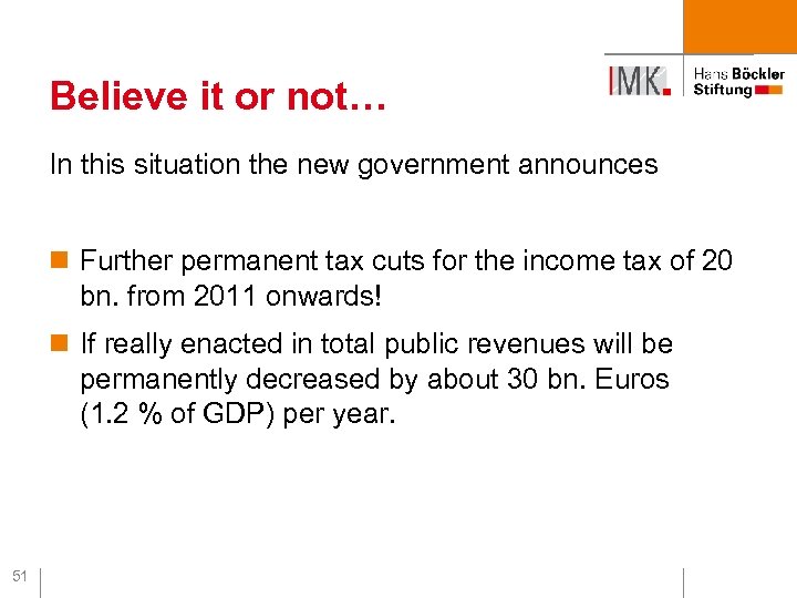 Believe it or not… In this situation the new government announces n an immediate growth acceleration programme = further permanent tax cuts of about 8. 5 bn. Euros. . n Half of it goes into higher child benefits/allowances n 2 bn go into lower business taxation n 0. 5 bn. to lower inheritance taxes n 1 bn. to reduced vat rate for hotels IMK estimate of one-off growth effect: 0. 2 % of GDP 49