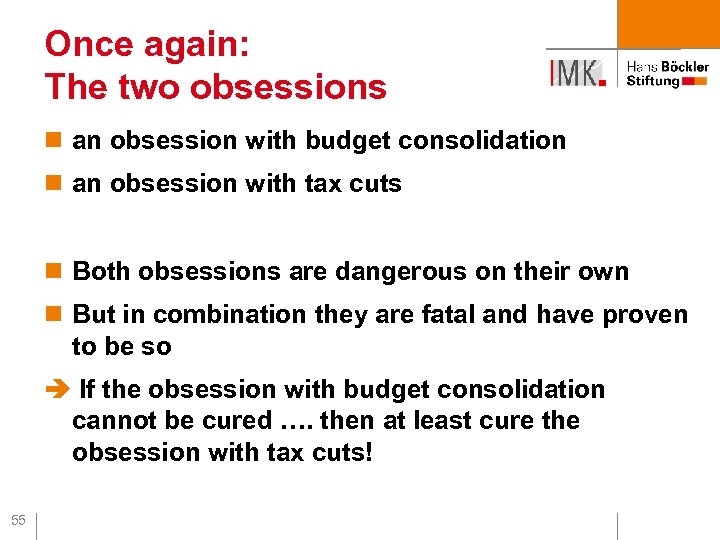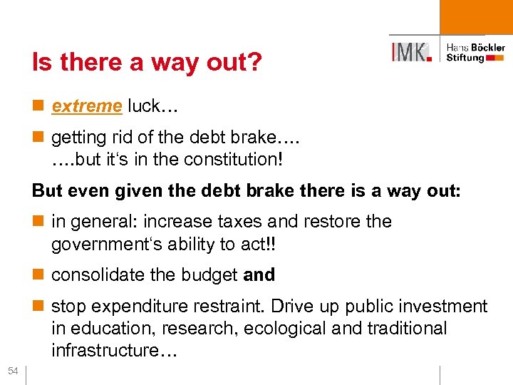 Is there a way out? n extreme luck… n getting rid of the debt brake…. …. but it‘s in the constitution! But even given the debt brake there is a way out: n in general: increase taxes and restore the government‘s ability to act!! n consolidate the budget and n stop expenditure restraint. Drive up public investment in education, research, ecological and traditional infrastructure… 54
