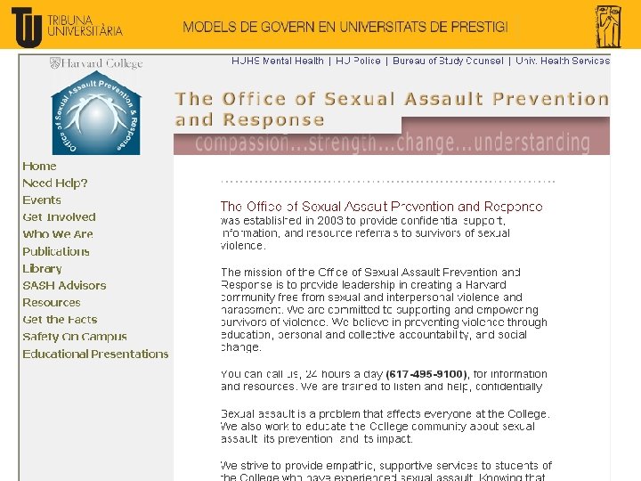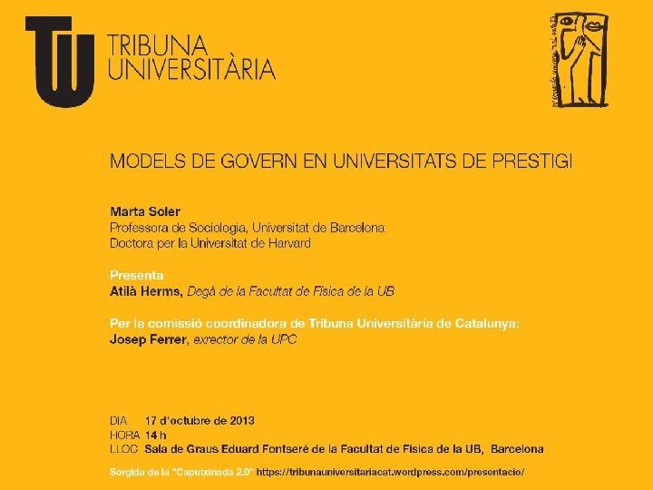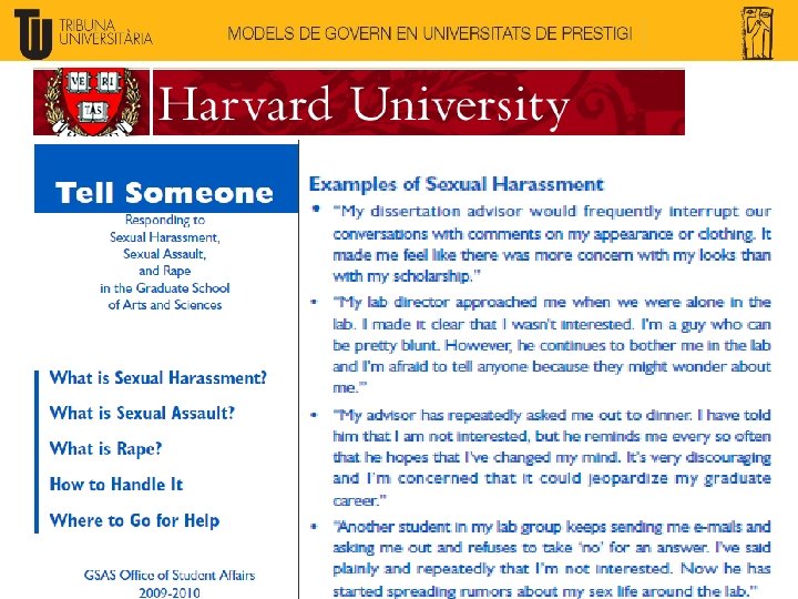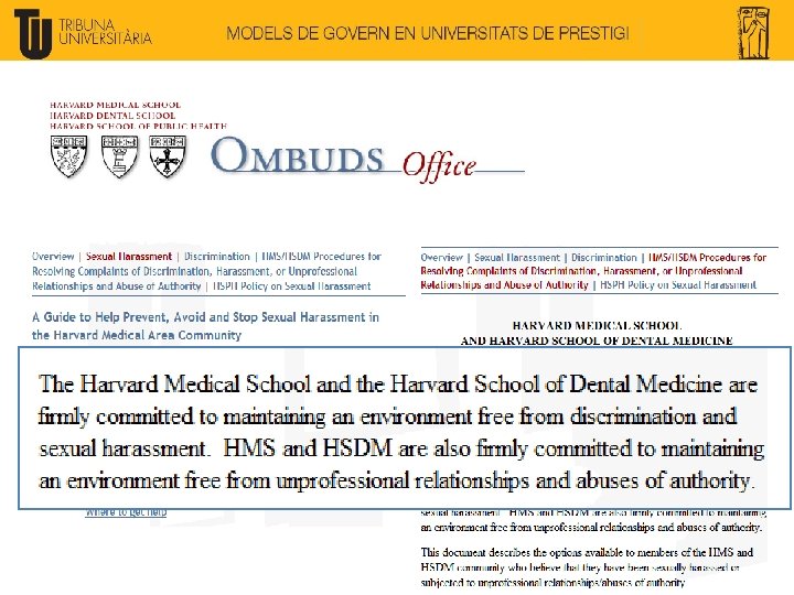 Harvard U: Harvard Corporation (President and Fellows): 12+1: - Normalment ex-alumnes, en posicions destacades a la societat i a l’economia. Nomenats i elegits pels propis Fellows. Nomenen el President de Harvard i estan molt propers a la presa de decisions (Board executiva). Board of Overseers: 30 membres: - Elegits per Alumni. Cada any els ex-alumnes elegim 5 nous membres, dels nominats per la Harvard Alumni Association. - 2 ex-officio (President i Tresorer de Harvard) Té un rol més consultiu, d’establir prioritats i posar Harvard en posicions de lideratge. Fa una avaluació externa de la qualitat i direcció de la universitat.