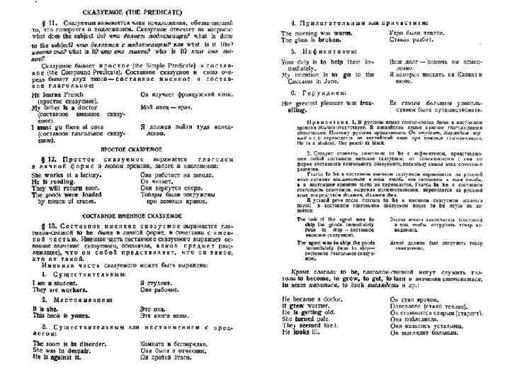 Try to find predicates… 1. Hе was still asleep when the snow began to fall. -- Он еще спал, когда начал идти снег. 2. I want to remind you of a promise you made to me. -- Я хочу напомнить вам об обещании, которое вы мне дали 3. The snow had ceased falling. -Снег перестал идти. 1. Heat can melt ice, vaporize water and cause bodies to expand. -Тепло может растопить лед, превратить воду в пар и вызвать расширение тел. 2. The airplane got covered with ice and they had to make a forced landing. -- Самолет обледенел, и им пришлось сделать вынужденную посадку. 3. You are to follow the doctor's prescription. -- Вы должны следовать предписанию врача.