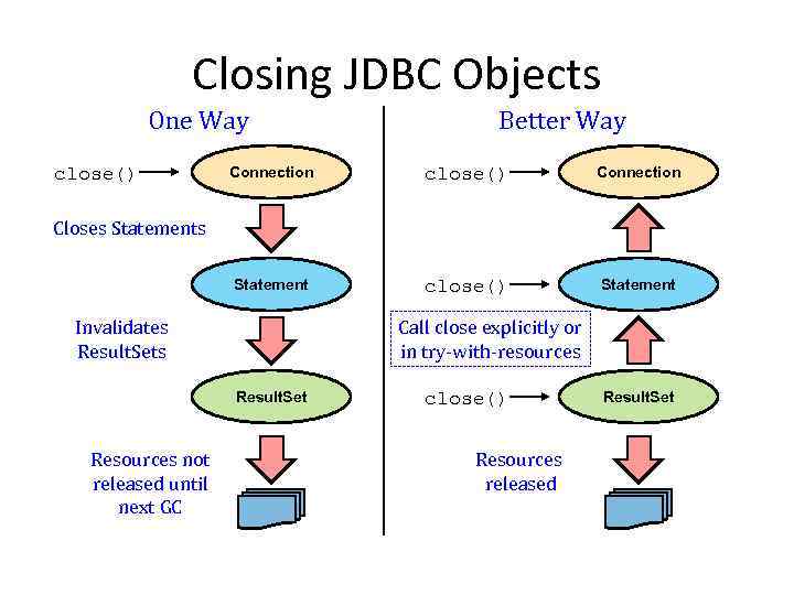 Closing JDBC Objects One Way close() Better Way Connection close() Connection Statement close() Statement Closes Statements Invalidates Result. Sets Call close explicitly or in try-with-resources Result. Set Resources not released until next GC close() Resources released Result. Set