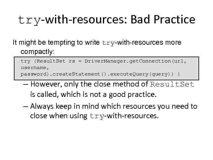 try-with-resources: Bad Practice It might be tempting to write try-with-resources more compactly: • try (Result. Set rs = Driver. Manager. get. Connection(url, username, password). create. Statement(). execute. Query(query)) { – However, only the close method of Result. Set is called, which is not a good practice. – Always keep in mind which resources you need to close when using try-with-resources.