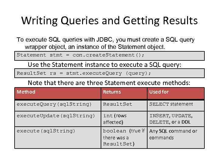 Writing Queries and Getting Results To execute SQL queries with JDBC, you must create a SQL query wrapper object, an instance of the Statement object. Statement stmt = con. create. Statement(); Use the Statement instance to execute a SQL query: Result. Set rs = stmt. execute. Query (query); Note that there are three Statement execute methods: Method Returns Used for execute. Query(sql. String) Result. Set SELECT statement execute. Update(sql. String) int (rows affected) INSERT, UPDATE, DELETE, or a DDL execute(sql. String) boolean (true if Any SQL command or there was a commands Result. Set)