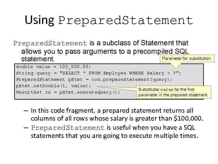 Using Prepared. Statement is a subclass of Statement that allows you to pass arguments to a precompiled SQL Parameter for substitution. statement. double value = 100_000. 00; String query = "SELECT * FROM Employee WHERE Salary > ? "; Prepared. Statement p. Stmt = con. prepare. Statement(query); p. Stmt. set. Double(1, value); Substitutes value for the first Result. Set rs = p. Stmt. execute. Query(); parameter in the prepared statement. – In this code fragment, a prepared statement returns all columns of all rows whose salary is greater than $100, 000. – Prepared. Statement is useful when you have a SQL statements that you are going to execute multiple times.