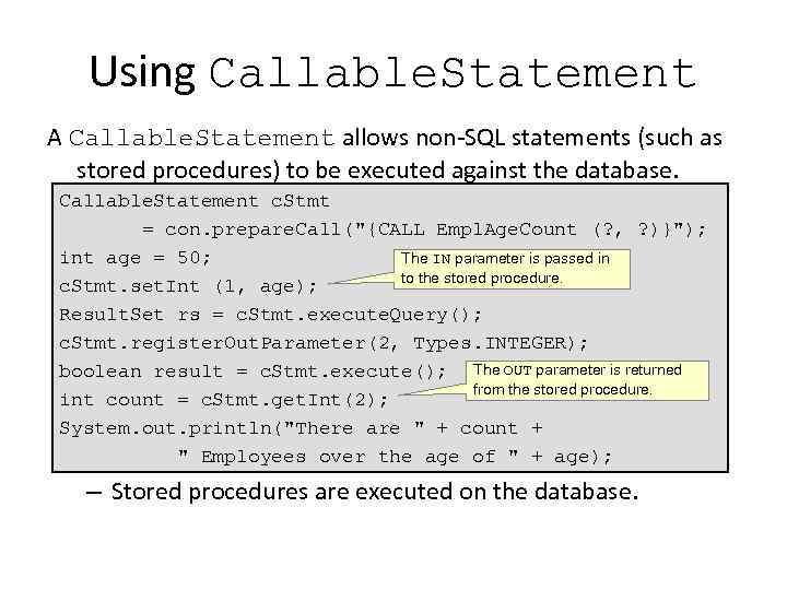 Using Callable. Statement A Callable. Statement allows non-SQL statements (such as stored procedures) to be executed against the database. Callable. Statement c. Stmt = con. prepare. Call("{CALL Empl. Age. Count (? , ? )}"); The IN parameter is passed in int age = 50; to the stored procedure. c. Stmt. set. Int (1, age); Result. Set rs = c. Stmt. execute. Query(); c. Stmt. register. Out. Parameter(2, Types. INTEGER); boolean result = c. Stmt. execute(); The OUT parameter is returned from the stored procedure. int count = c. Stmt. get. Int(2); System. out. println("There are " + count + " Employees over the age of " + age); – Stored procedures are executed on the database.