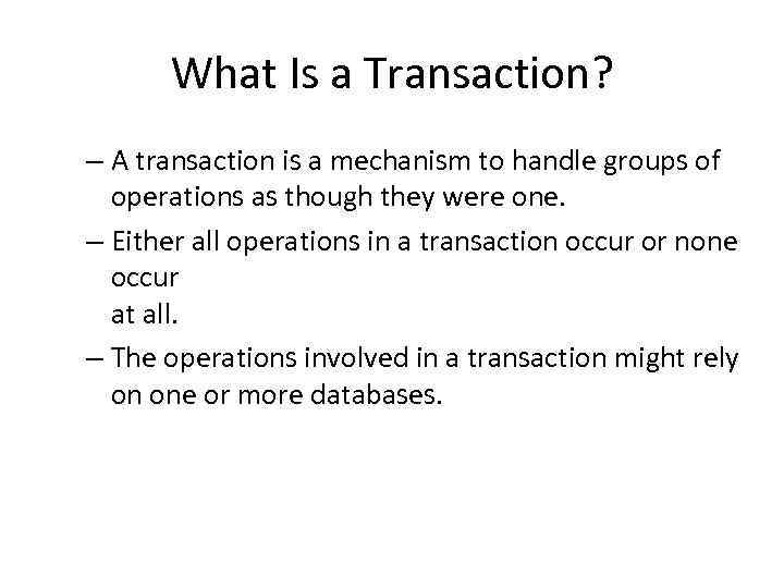 What Is a Transaction? – A transaction is a mechanism to handle groups of operations as though they were one. – Either all operations in a transaction occur or none occur at all. – The operations involved in a transaction might rely on one or more databases.