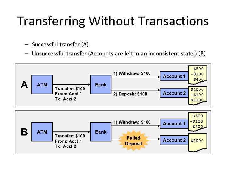 Transferring Without Transactions – Successful transfer (A) – Unsuccessful transfer (Accounts are left in an inconsistent state. ) (B) Account 1 $500 -$100 $400 2) Deposit: $100 Account 2 $1000 +$100 $1100 1) Withdraw: $100 $500 -$100 Account 1 $400 1) Withdraw: $100 A B ATM Transfer: $100 From: Acct 1 To: Acct 2 Bank Failed Deposit Account 2 $1000