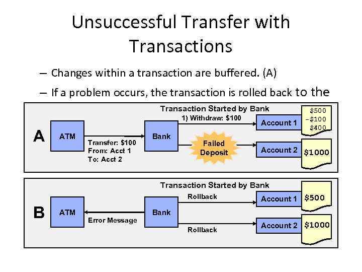 Successful Transfer with Transactions – Changes within a transaction are buffered. (A) – If a transfer is successful, changes are committed (made permanent). (B) Transaction Started by Bank 1) Withdraw: $100 A ATM Transfer: $100 From: Acct 1 To: Acct 2 Account 1 $500 -$100 $400 Account 2 $1000 +$100 $1100 Bank 2) Deposit: $100 Transaction Started by Bank Commit B ATM Transfer Successful Account 1 $400 Bank Commit Account 2 $1100