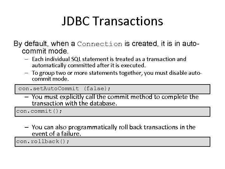 JDBC Transactions By default, when a Connection is created, it is in autocommit mode. – Each individual SQL statement is treated as a transaction and automatically committed after it is executed. – To group two or more statements together, you must disable autocommit mode. con. set. Auto. Commit (false); – You must explicitly call the commit method to complete the transaction with the database. con. commit(); – You can also programmatically roll back transactions in the event of a failure. con. rollback();