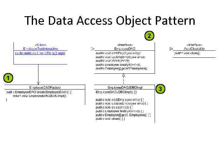 Data Access Objects Consider an employee table like the one in the sample JDBC code. – By combining the code that accesses the database with the “business” logic, the data access methods and the Employee table are tightly coupled. – Any changes to the table (such as adding a field) will require a complete change to the application. – Employee data is not encapsulated within the example application.