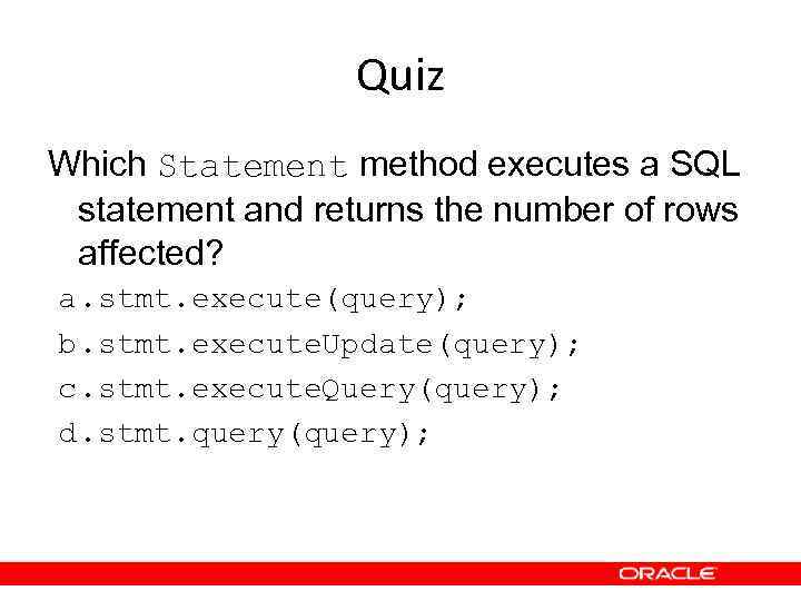 Quiz Which Statement method executes a SQL statement and returns the number of rows affected? a. stmt. execute(query); b. stmt. execute. Update(query); c. stmt. execute. Query(query); d. stmt. query(query);