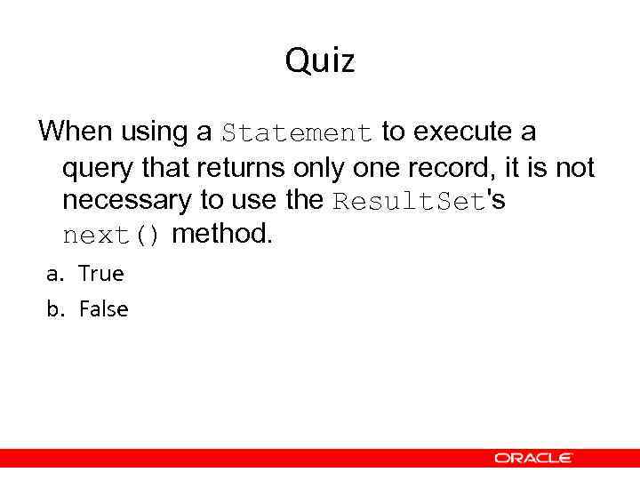 Quiz When using a Statement to execute a query that returns only one record, it is not necessary to use the Result. Set's next() method. a. True b. False