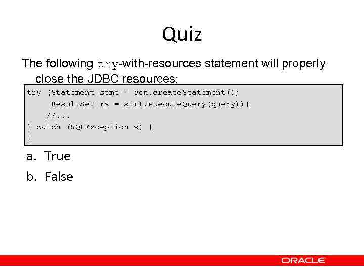 Quiz The following try-with-resources statement will properly close the JDBC resources: try (Statement stmt = con. create. Statement(); Result. Set rs = stmt. execute. Query(query)){ //. . . } catch (SQLException s) { } a. True b. False