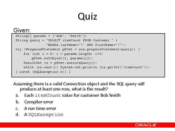 Quiz Given: String[] params = {"Bob", "Smith"}; String query = "SELECT item. Count FROM Customer " + "WHERE last. Name='? ' AND first. Name='? '"; try (Prepared. Statement p. Stmt = con. prepare. Statement(query)) { for (int i = 0; i < params. length; i++) p. Stmt. set. Object(i, params[i]); Result. Set rs = p. Stmt. execute. Query(); while (rs. next()) System. out. println (rs. get. Int("item. Count")); } catch (SQLException e){ } Assuming there is a valid Connection object and the SQL query will produce at least one row, what is the result? a. Each item. Count value for customer Bob Smith b. Compiler error c. A run time error d. A SQLException