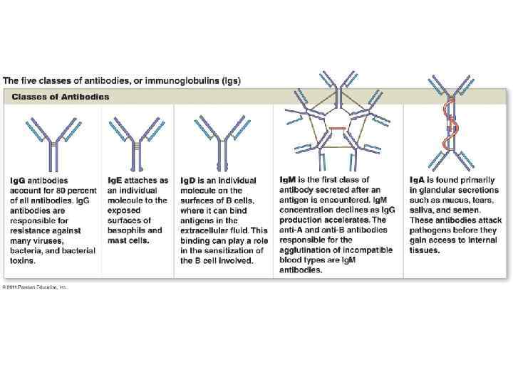 ANTIBODIES (IMMUNOGLOBULINS) Ø There a number of types of antibodies or immunoglobulins that react stereochemically and specifically with an antigen that induced their formation. Ø Five immunoglobulin classes are defined on the basis of their heavy chain composition, named Ig. G, Ig. M, Ig. A, Ig. E, and Ig. D. Ig. G and Ig. A are further divided into subclasses. Ø Each of these classes of immunoglobulins (abbreviated Ig) is produced by a specific clone of plasma cells. Their synthesis occurs at different stages and rates during an immune response and/or during the course of an infection. Ø The classes of immunoglobulins have different physical and chemical characteristics and they exhibit unique biological properties. Their importance and functions in host resistance are different.