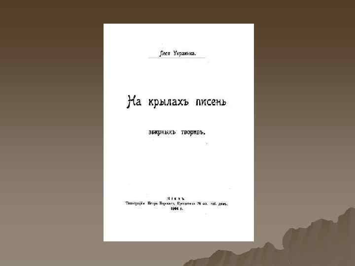Ле ся Украї нка u u (справжнє ім'я: Лари са Петрі вна Ко сач-Кві тка; *13 (25) лютого 1871, Новоград-Волинськ — † 19 липня (1 серпня) 1913, Сурамі, Грузія) — українська письменниця, перекладач, культурний діяч. Писала у найрізноманітніших жанрах: поезії, ліриці, епосі, драмі, прозі, публіцистиці. Також працювала в ділянці фольклористики (220 народних мелодій записано з її голосу) і брала активну участь в українському національному русі. Відома завдяки своїм збіркам поезій «На крилах пісень» (1893), «Думи і мрії» (1899), «Відгуки» (1902), поем «Давня казка» (1893), «Одно слово» (1903), драм «Бояриня» (1913), «Кассандра» (1903 -1907), «В катакомбах» (1905), «Лісова пісня» (1911) та ін.