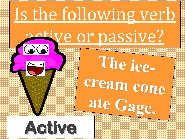 Is the following verb active or passive? Active The icecream cone ate Gage.