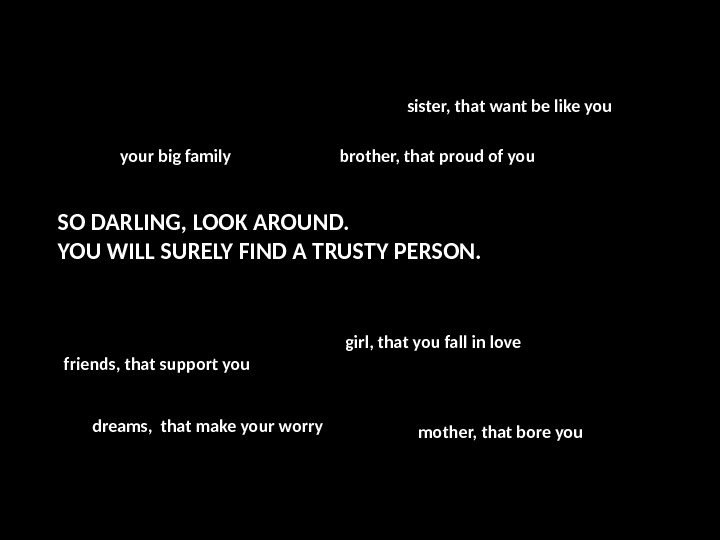 mother, that bore youfriends, that support your big family sister, that want be like you brother, that proud of you girl, that you fall in love dreams, that make your worry. SO DARLING, LOOK AROUND. YOU WILL SURELY FIND A TRUSTY PERSON.