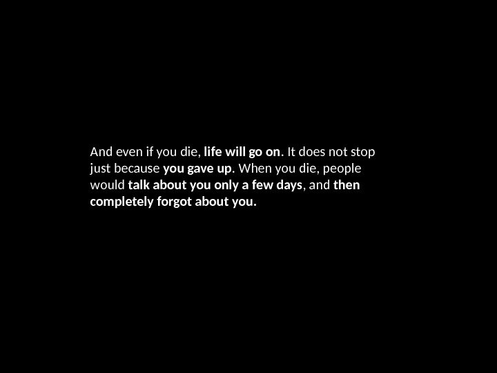 And even if you die, life will go on. It does not stop just because you gave up. When you die, people would talk about you only a few days , and then completely forgot about you.