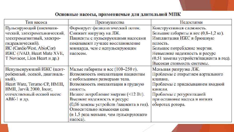 Недостатки пульсирующий насосов. невозможность их амбулаторного использования низкая скорость потока по сравнению с имплантируемыми устройствами. После 5— 7 сут, если уйти от вспомогательного кровообращения невозможно, пульсирующий насос отключают и имплантируют одно из устройств для длительного вспомогательного кровообращения.