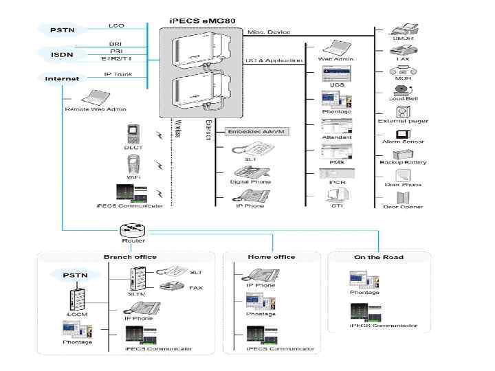 i. PECS e. MG-80 KSUI • 1 порт цифрового системного телефона и 7 портов гибридных интерфейсов; • 2 канала для голосовой почты; • 2 канала Vo. IP; • Слот для установки платы интерфейса ISDN PRI или BRI.