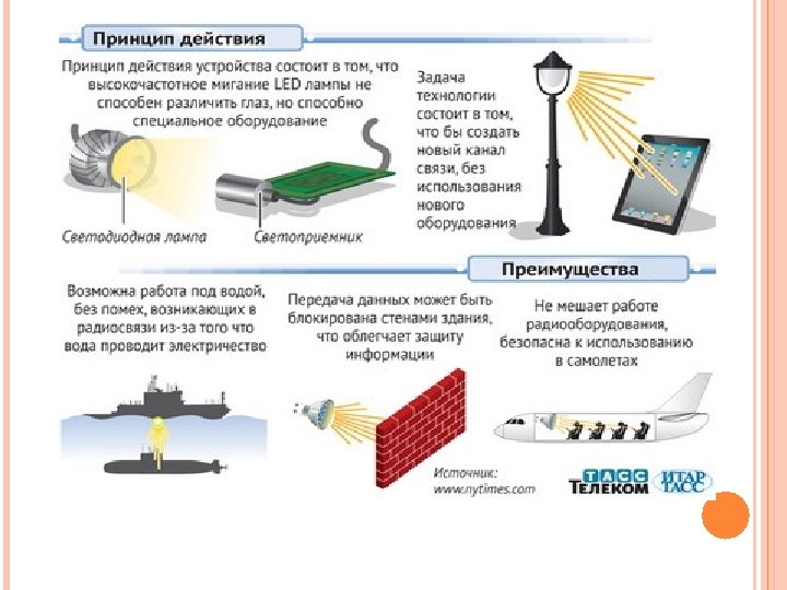 1. Изначально, использование света как носителя сигала Wi. Fi способно не просто поднять пропускную способность (ведь, чем частота волны меньше, тем меньше можно передать информации), оно изменит и показатели мощности. 2. Данная частота позволит избежать снижения мощности указанного сигнала (в сравнении с традиционными Wi-Fi сетями, чья производительность полностью зависит от того, какое количество пользователей подключено к 1 точке доступа Wi-Fi).